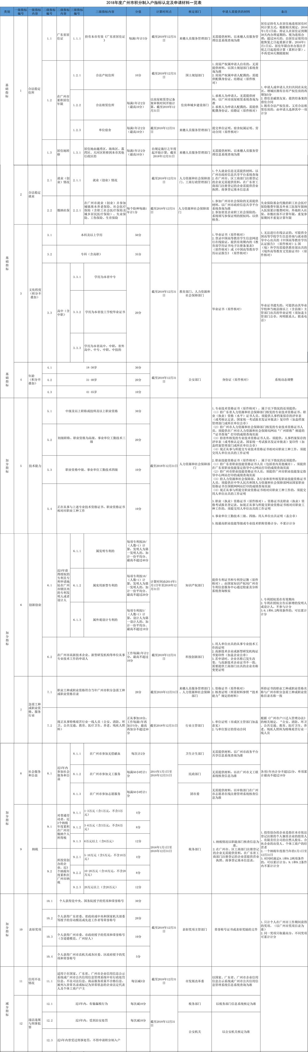 2018年度广州市积分制入户指标认定及申请材料一览表