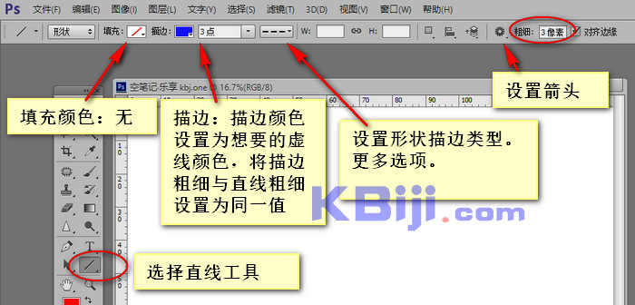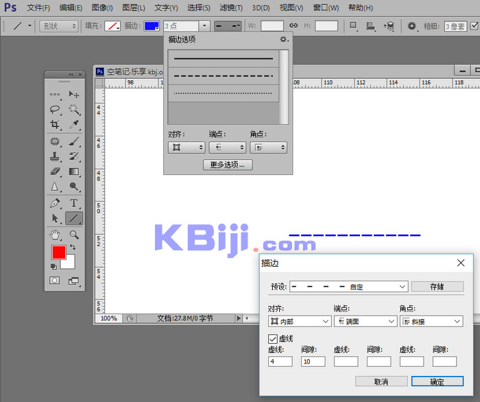 1、新建图层 选择直线工具(右键矩形工具按钮)。2、填充颜色设置为无色。3、将描边颜色设置为想要的虚线颜色,将描边粗细与直线粗细设置为同一值。4、单击描边选项,在“更多选项”中设置详细内容,如图所示。5、绘制直线。 标签: